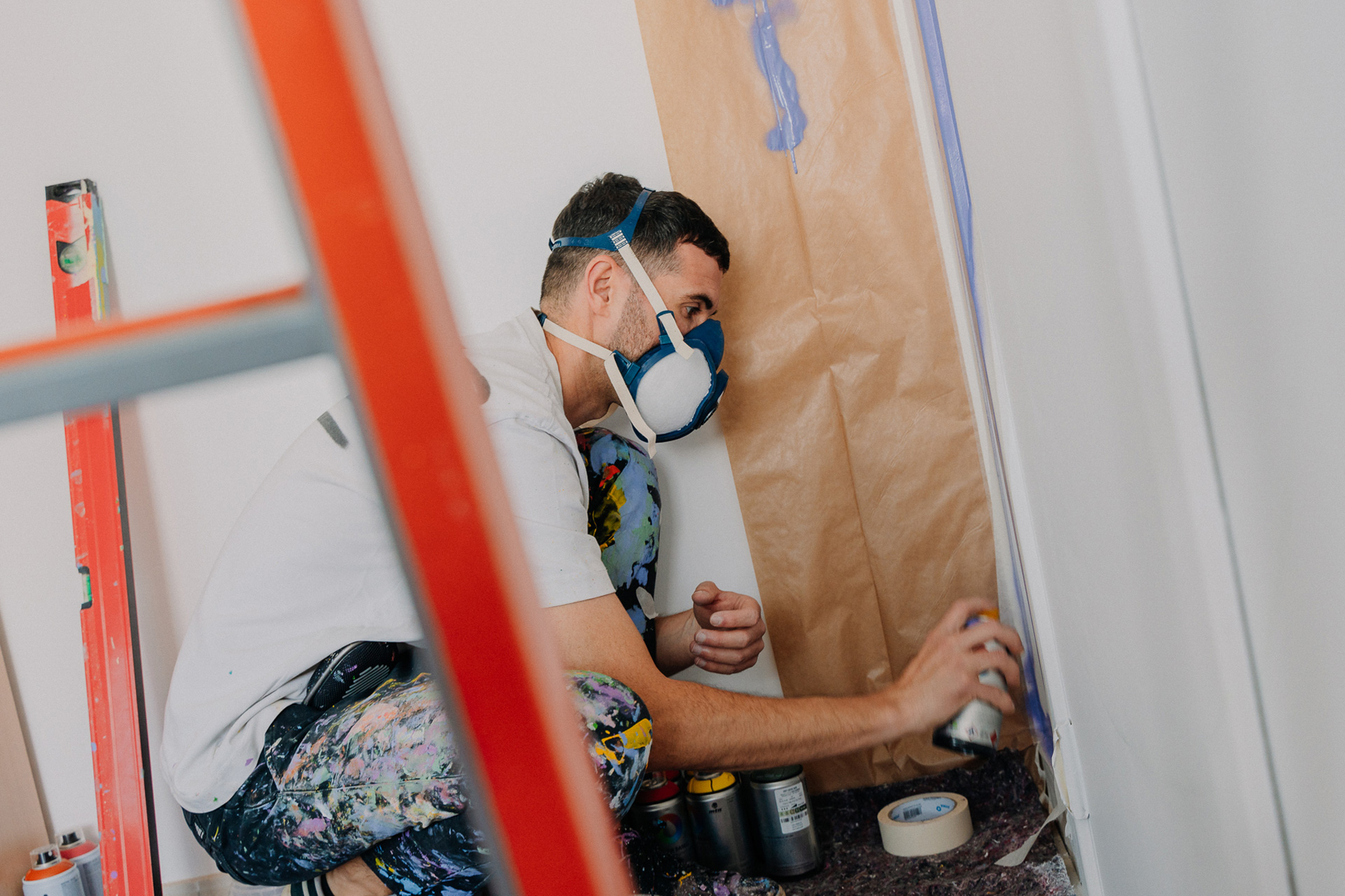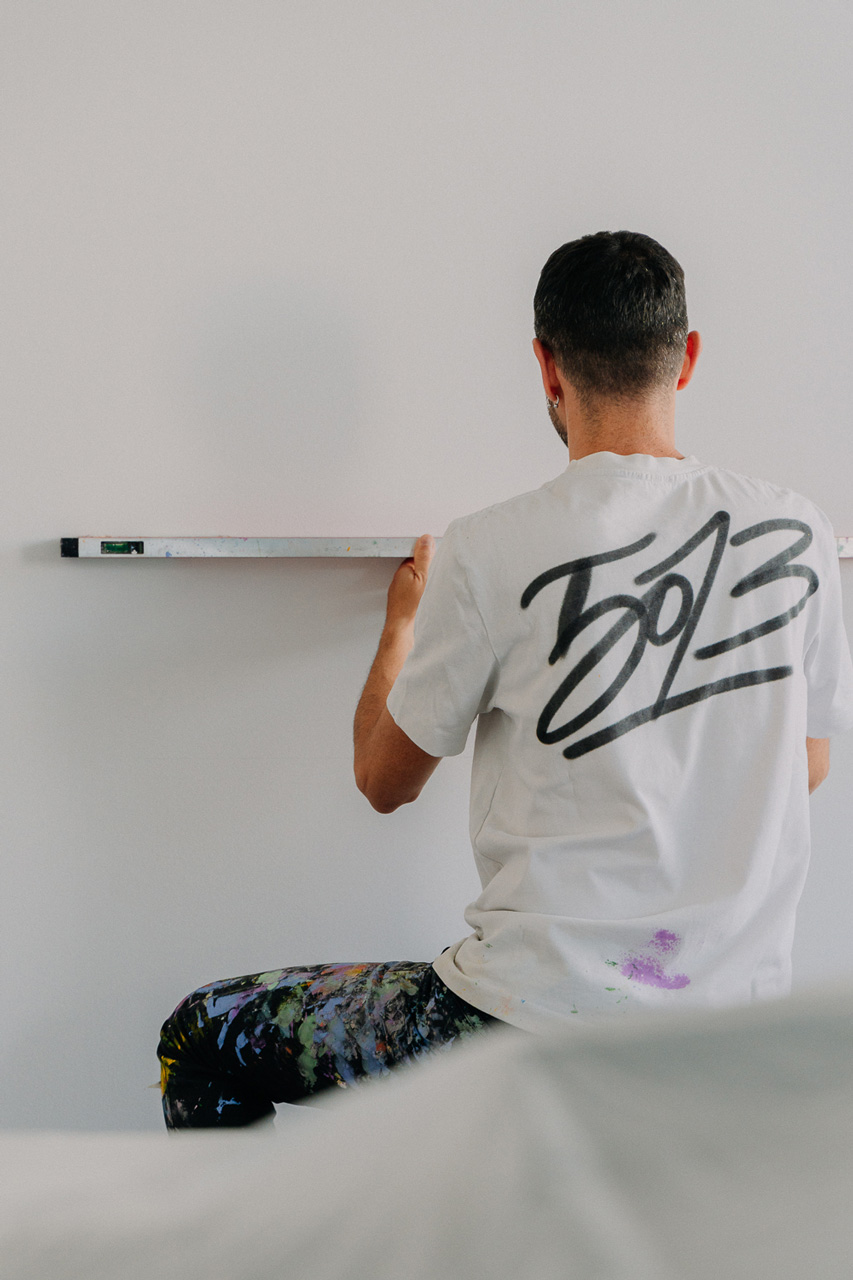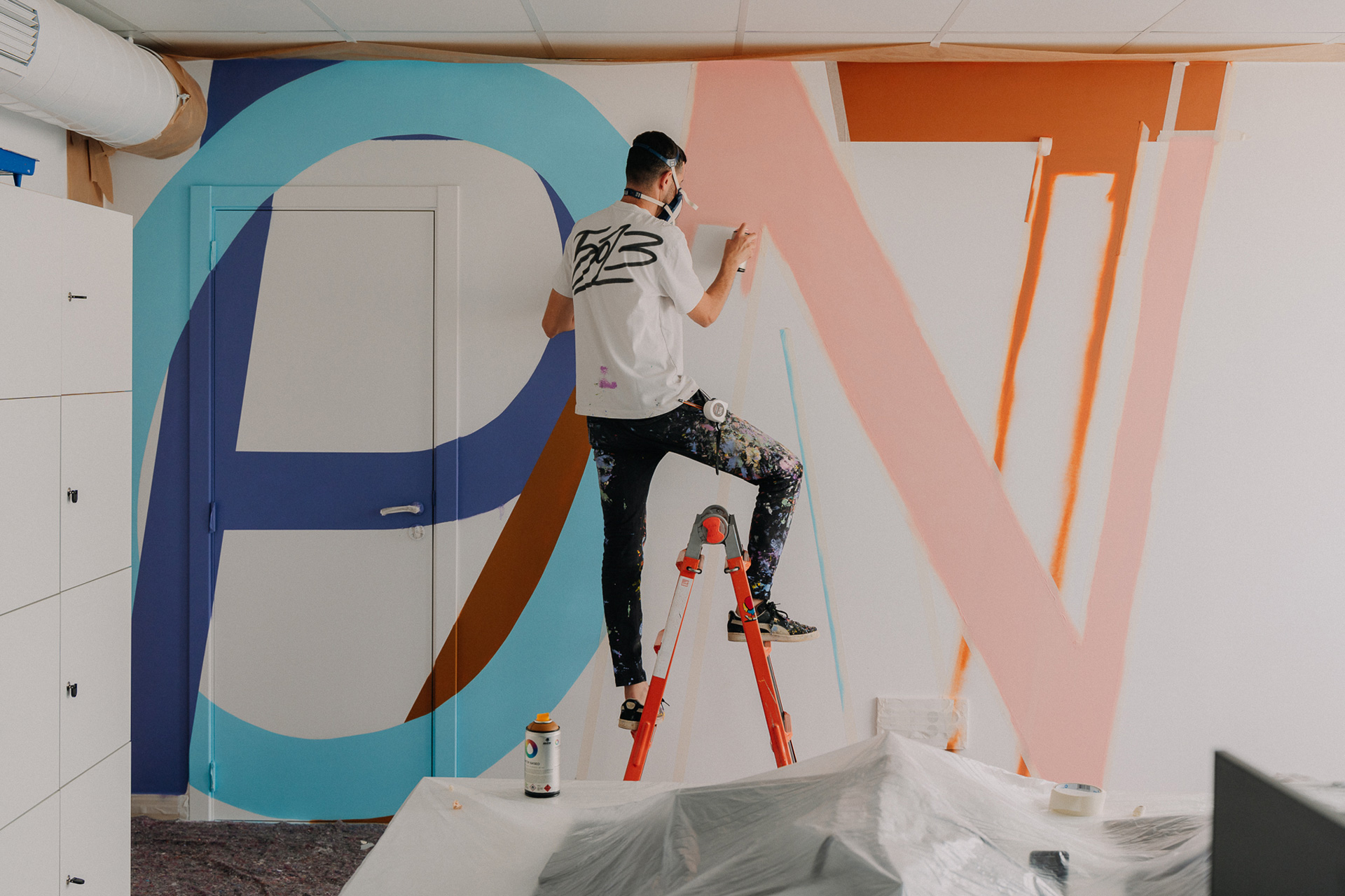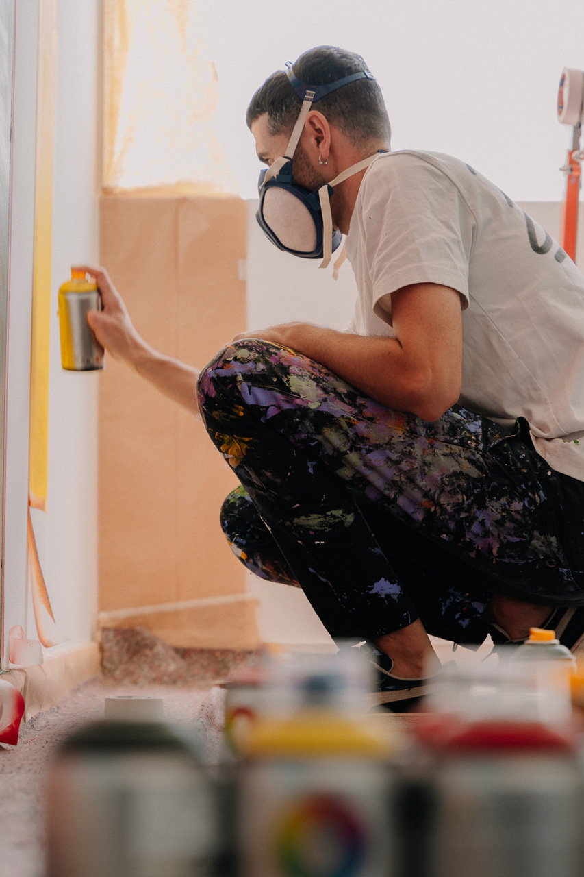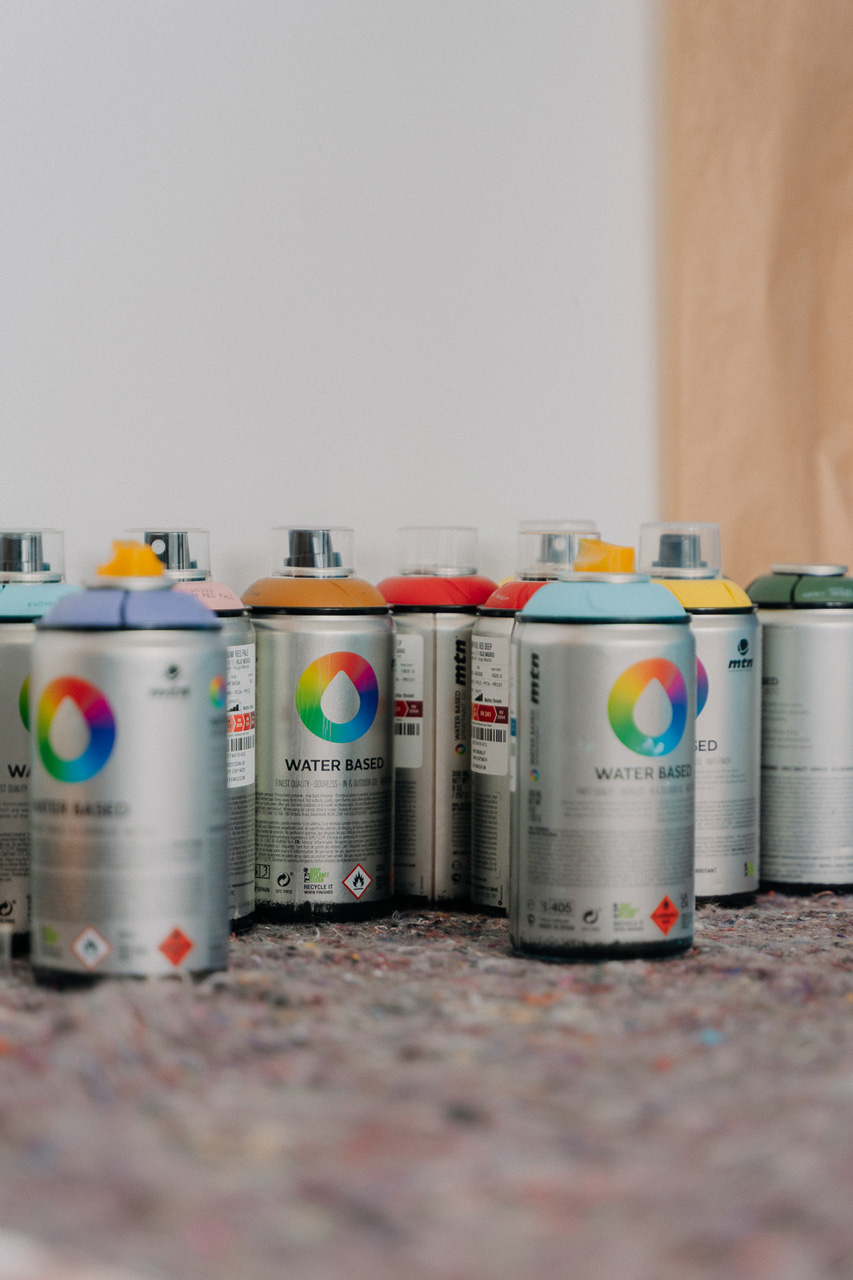 El mural se ejecuta con aerosoles al agua, reduciendo el impacto ambiental y adecuándose al contexto interior.